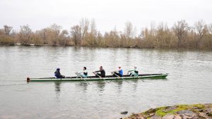 Master-Männer 4x+ Altersklasse D: Bei guten Bedingungen ging es gleich zu Beginn für das erfahrene Masterboot der Männer an den Start. Kurzfristig musste sich leider Philipp Stockmar krankheitsbedingt abmelden, konnte aber durch Stefan Heyde (Limburger CfW) ersetzt werden, mit dem wir ohnehin in der Altersklasse E an den Start gingen. In sehr guten 17:13 min setzte sich die Mannschaft mit Wolfgang Friedrich, Nicolas Seiffert, Stefan Heyde und Jörg Scheiner mit Steuerfrau Jutta Will (Limburger CfW) deutlich gegenüber der Konkurrenz durch und belegte den ersten Platz. Im gleichen Rennen konnte das zweite Boot der FRGO mit Sven Gleixner, Guillaume Texier, Antoine Rausch und Peter Gillmann ebenfalls gesteuert von Jutta Will mit 19:45 min einen sehr guten 3. Platz errudern.