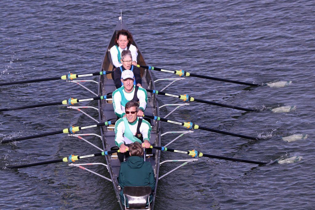 Danach ging es für den Männer Gig 4x+ ebenfalls in der Altersklasse D aufs Wasser und für Wolfgang Friedrich, Nicolas Seiffert, Philipp Stockmar und Jörg Scheiner, wieder gesteuert von Cosima, war auch hier das angestrebte Ziel ein Sieg. In dem Rennen mit drei Konkurrenten ging es vom Start weg bei durchgehend Schlagzahl 30 über die Strecke. Bei sehr gut laufendem Boot waren die ersten beiden Konkurrenten bei Streckenhälfte sogar eingeholt und überholt, so dass letztlich mit 16:15 min ein souveräner Sieg mit mehr als 1:45 min Vorsprung auf den Zweitplatzierten heraussprang.